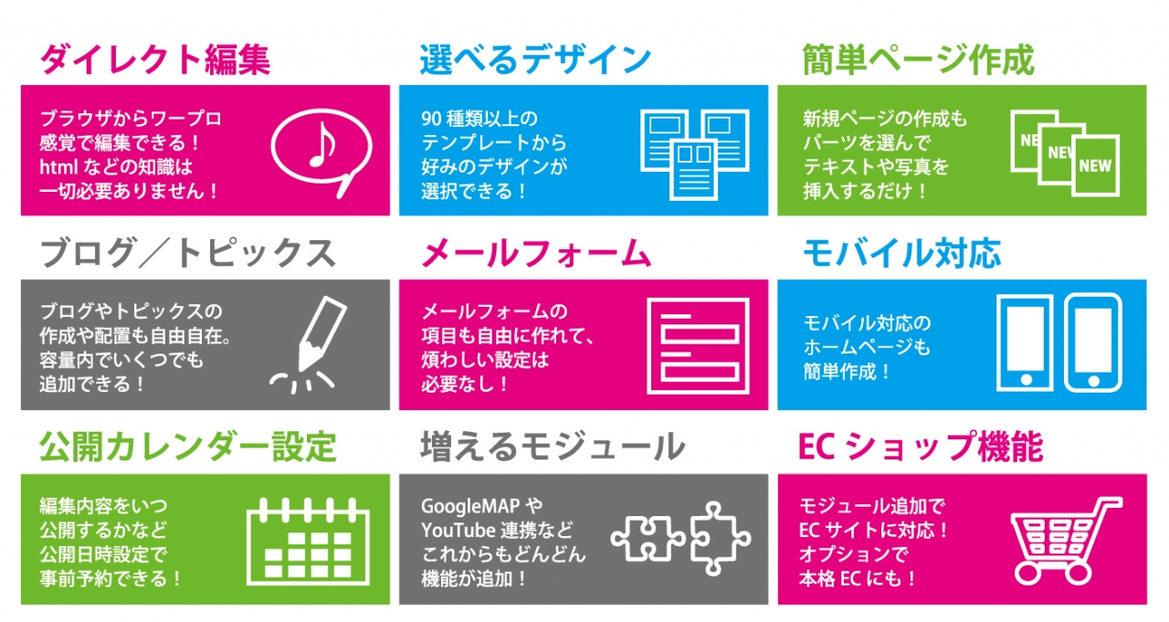 CMS「E7」には主に下記のような機能があり、ホームページを簡単にすることができます。